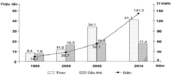 Cho biểu đồ than, dầu thô và điện của nước ta, giai đoạn 1995 – 2014