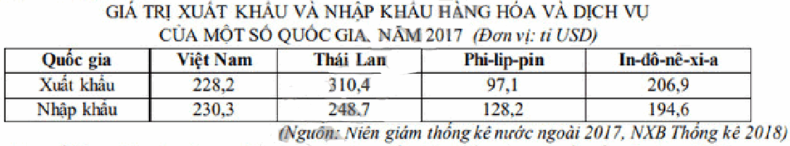 Cho bảng số liệu Giá trị xuất khẩu và nhập khẩu hàng hóa và dịch vụ của một số quốc gia năm 2017 (Đơn vị tỉ USD)