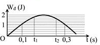 Từ đồ thị ta thấy động năng cực đại là 2J, tại 0,1s và 0,3 s thì động năng bằng một nửa giá trị cực đại.