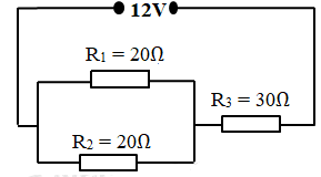 \(\begin{array}{l}{R_{12}} = \frac{{{R_1}.{R_2}}}{{{R_1} + {R_2}}} = \frac{{20.20}}{{20 + 20}} = 10\Omega \\ \Rightarrow {R_{td}} = {R_{12}} + {R_3} = 10 + 20 = 30\Omega \\ \Rightarrow I = \frac{U}{{{R_{td}}}} = \frac{{12}}{{30}} = 0,4A \\\Rightarrow P = U.I = 12.0,4 = 4,8W\end{array}\)
