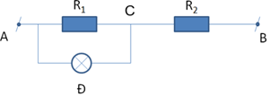 Cường độ dòng điện qua đèn khi này: \({I_D} = \frac{{{U_D}}}{{{R_D}}} = \frac{{{U_{AC}}}}{{{R_D}}} = \frac{{14,4}}{{24}} = 0,6A\)