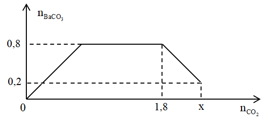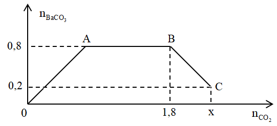 Câu 18 : Cho từ từ x mol khí CO2 vào 500 gam dung dịch hỗn hợp KOH và Ba(OH)2. Kết quả thí nghiệm được biểu diễn theo biểu đồ sau: