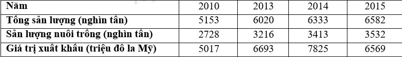 Đê thể hiện sản lượng và giá trị xuất khẩu thủy sản của nước ta giai đoạn 2010 – 2015 theo bảng số liệu, biểu đồ nào sau đây là thích hợp nhất?