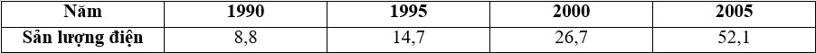 Căn cứ vào bảng số liệu, cho biết nhận xét nào sau đây đúng với sản lượng điện của Việt Nam từ 1990 – 2005?