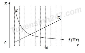 Mạch điện gồm điện trở thuần R nối tiếp với hộp đen X và hộp đen Y. Biết X, Y là hai hộp có trở kháng phụ thuộc vào tần số như hình vẽ. Hiệu điện thế hiệu dụng hai đầu đoạn mạch là không đổi và bằng 210V. Khi thay đổi tần số dòng điện thì công suất tiêu thụ điện năng lớn nhất của mạch điện là 200W và khi đó điện áp trên X là 60V. Khi đưa tần số mạch điện tới giá trị là 50Hz thì công suất của mạch gần giá trị nào nhất?
