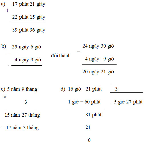 a) 17 phút 21 giây + 22 phút 15 giây
