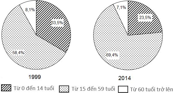 A.Sự thay đổi cơ cấu dân số phân theo nhóm tuổi năm 1999 và 2014.