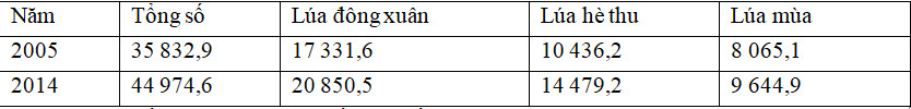 Thể hiện quy mô về sản lượng lúa của nước ta năm 2005 và năm 2014, nếu đặt bán kính biểu đồ tròn năm 2005 là 1 đơn vị, thì bán kính biểu đồ tròn năm 2014 là bao nhiêu đơn vị bán kính?