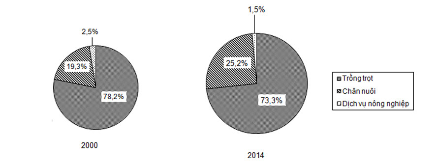 Qui mô và cơ cấu giá trị sản xuất phân theo ngành của ngành nông nghiệp nước ta năm 2000 và 2014