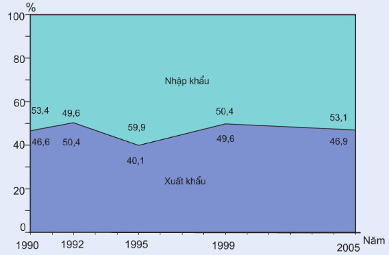 Câu 19. Cho biểu đồ Cơ cấu giá trị xuất, nhập khẩu của nước ta giai đoạn 1990-2005 (đơn vị %)