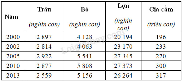 Để thể hiện tốc độ tăng trưởng số đàn gia súc và gia cầm nước ta giai đoạn từ năm 2000 đến 2013, biểu đồ nào sau đây thích hợp nhất?