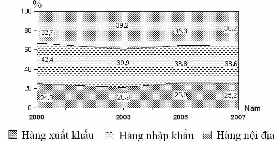 B. Giai đoạn từ năm 2000 đến năm 2007, tỉ trọng khối lượng vận chuyển hàng xuất khẩu của nước ta tăng, tỉ trọng hàng nhập khẩu giảm, tỉ trọng khối lượng vận chuyển hàng nội địa tăng.