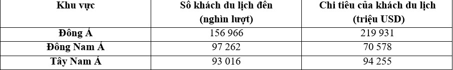B. Số khách du lịch quốc tế đến khu vực Đông Á đông nhất, nhưng mức chi tiêu bình quân của du khách quốc tế ở khu vực này lại thấp hơn so với khu vực Tây Nam Á