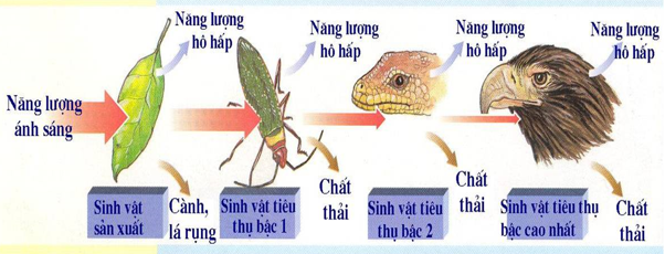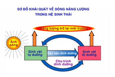 – Bắt nguồn từ môi trường, được sinh vật sản xuất hấp thụ và biến đổi thành năng lượng hóa học qua quá trình quang hợp. Sau đó năng lượng được truyền qua các bậc dinh dưỡng và cuối cùng năng lượng truyền trở lại môi trường.