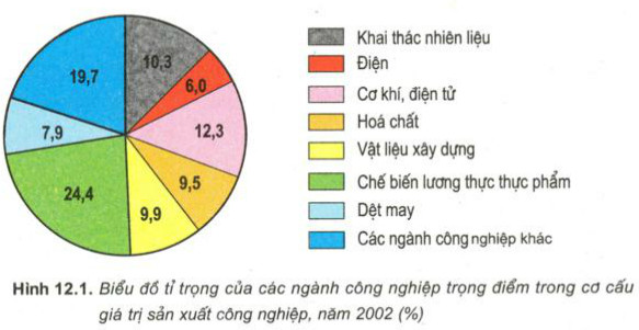 Dựa vào hình 12.1, hãy xếp thứ tự các ngành công nghiệp trọng điểm của nước ta theo tỉ trọng từ lớn đến nhỏ.