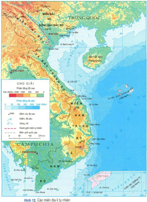 Dựa vào hình 12 và các kiến thức đã học, hãy xác định phạm vi 3 miền địa lí tự nhiên và đặc trưng cơ bản của mỗi miền về địa hình, khí hậu.