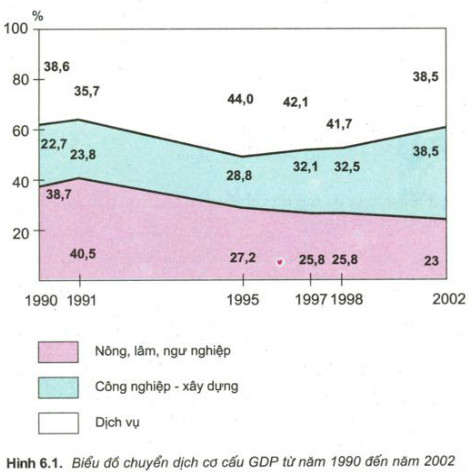Dựa vào hình 6.1, hãy phân tích xu hướng chuyển dịch cơ cấu ngành kinh tế.  Xu hướng này thể hiện rõ ở những khu vực nào?