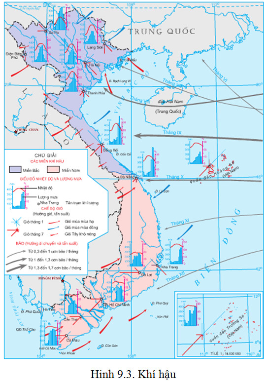 – Tần suất bão: Bão hoạt động mạnh nhất ở khu vực miền Trung nước ta (tần suất lớn nhất từ 1,3 đến 1,7 cơn bão/tháng), khu vực Nam Bộ ít chịu ảnh hưởng của bão nhất ( tần suất bão từ 0,3 đến 1 cơn bão/tháng).
