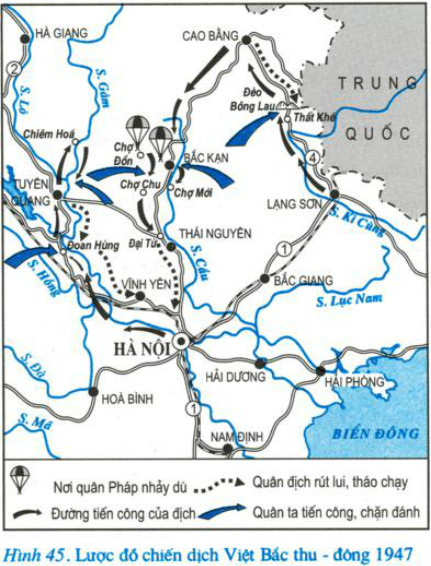Dựa vào lược đồ (Hình 45), trình bày diễn biến chiến dịch Việt Bắc thu – đông năm 1947