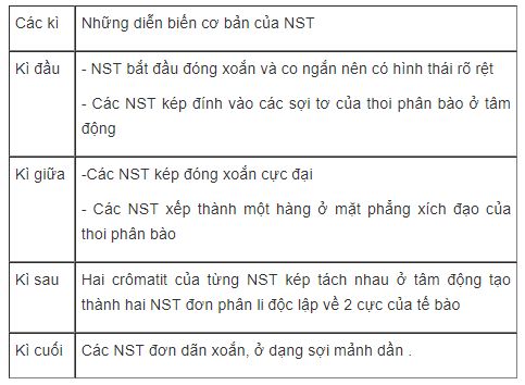 Bảng 9.2: Những diễn biến cơ bản của NST ở các kì của nguyên phân