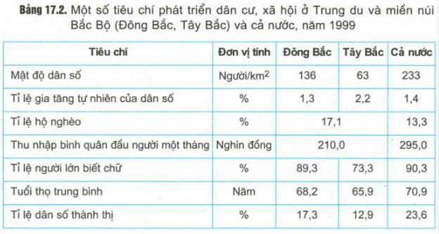 Dựa vào số liệu trong bảng 17.2, hãy nhận xét sự chênh lệch về dân cư, xã hội của hai tiểu vùng Đông Bắc và Tây Bắc.