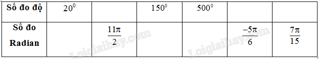 \({20^0} = 20.\frac{\pi }{{180}} = \frac{\pi }{9}\).                         \({150^0} = 150.\frac{\pi }{{180}} = \frac{{5\pi }}{6}\).                  \({500^0} = 500.\frac{\pi }{{180}} = \frac{{25\pi }}{9}\)