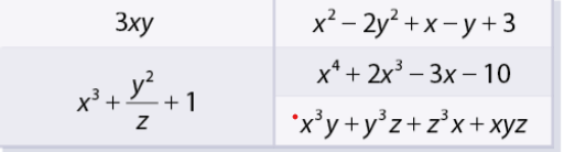 \(\begin{array}{l}{x^2} – 2{y^2} + x – y + 3\\{x^4} + 2{x^3} – 3x – 10\\{x^3}y + {y^3}z + {z^3}x + xyz\end{array}\)