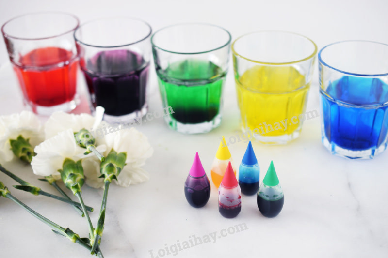 a) Sau khoảng một giờ cánh của bông hoa bắt đầu đổi màu giống với màu của dung dịch nước màu.