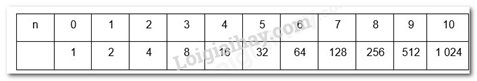 Tính các giá trị của \(2^n\) với n ∈ {0; 1; 2; 3; 4; 5; 6; 7; 8; 9; 10}