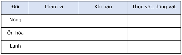 Quan sát hình 2 SGK và dựa vào kiến thức về các đới thiên nhiên trên Trái Đất để hoàn thành bảng.