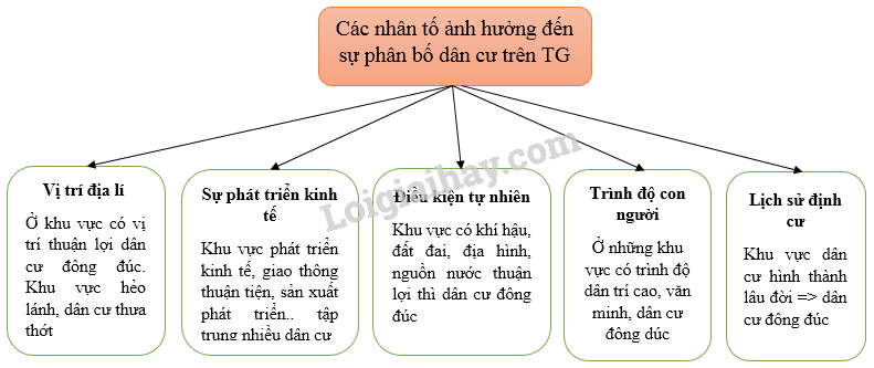 Hãy vẽ sơ đồ các nhân tố ảnh hưởng tới sự phân bố dân cư trên thế giới. Lấy ví dụ minh họa.