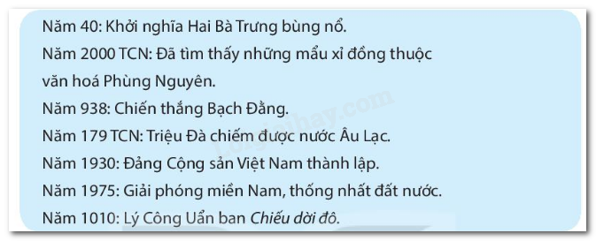 Hãy vẽ trục thời gian thể hiện các sự kiện lịch sử dưới đây theo đúng trình tự. Năm 40 Khởi nghĩa Hai Bà Trưng Năm 2000 Trước Công nguyên đã thấy những mẫu xỉ đồng thuộc văn hóa Phùng Nguyên