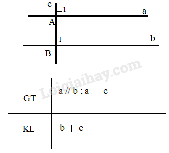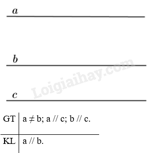 Vẽ hình minh họa và viết giả thiết, kết luận cho mỗi định lí sau: a) Nếu một đường thẳng vuông góc với một trong hai đường thẳng song song thì nó vuông góc với đường thẳng còn lại. b) Nếu hai đường thẳng phân biệt cùng song song với một đường thẳng khác thì chúng song song với nhau. c) Nếu hai đường thẳng cùng đi qua một điểm và cùng vuông góc với một đường thẳng khác thì hai đường thẳng đó trùng nhau.