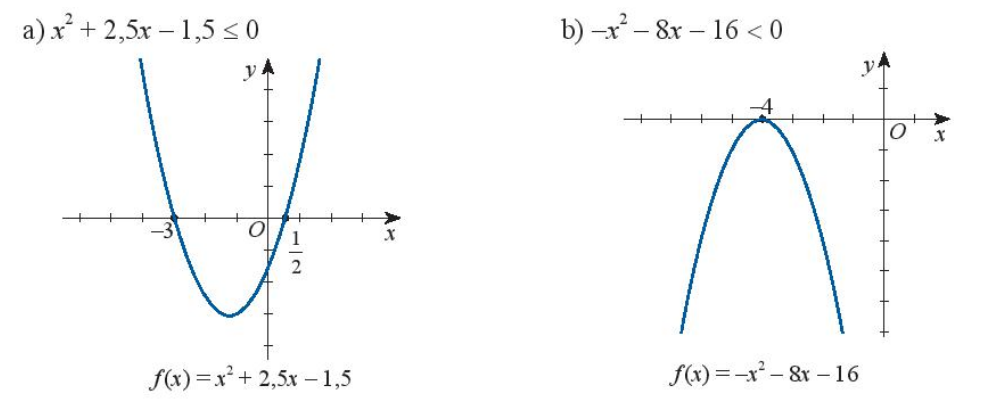 a) Dựa vào đồ thị ta thấy \({x^2} + 2,5x – 1,5 \le 0\) khi x thuộc đoạn \(\left[ { – 3;\frac{1}{2}} \right]\)