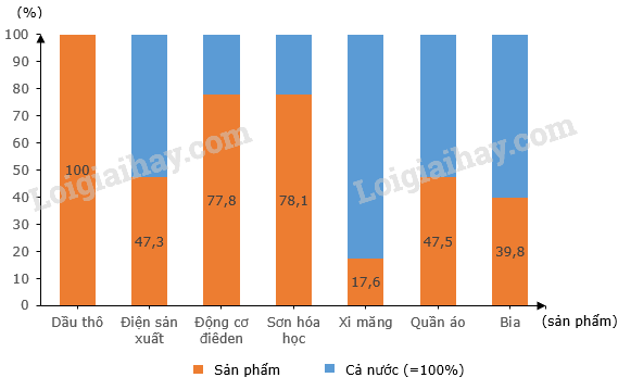 – Vẽ 7 cột chồng lần lượt thể hiện các sản phẩm tiêu biểu của các ngành công nghiệp trọng điểm ở Đông Nam Bộ so với cả nước (Cả nước = 100%).