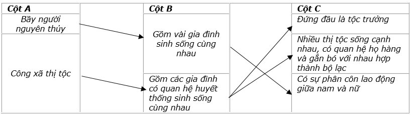 Em hãy nối các dữ kiện ở các cột A, B, C với nhau để thể hiện các giai đoạn tiến triển của xã hội nguyên thủy.