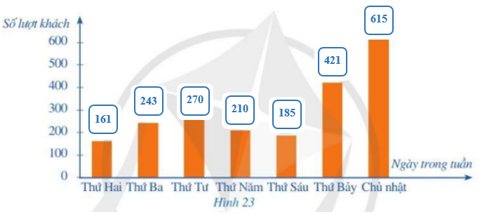 b)     Hãy hoàn thiện biểu đồ ở Hình 23 để nhận được biểu đồ cột biểu diễn các dữ liệu thống kê số lượt khách đến cửa hàng trong những ngày đó.