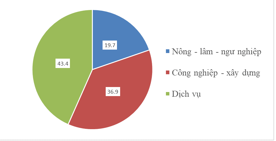 Giải bài 1 trang 17 vở bài tập Địa lí 9, Cho số liệu cơ cấu GDP của nước ta năm 2014. – Nông – lâm – ngư nghiệp: 19,7% – Công nghiệp – xây dựng: 36,9% – Dịch vụ: 43,4% Vẽ biểu đồ hình tròn thể hiện cơ cấu GDP của nước ta năm 2014.