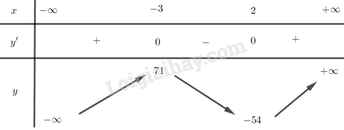 \(\begin{array}{l}y’ < 0 \Leftrightarrow x \in \left( { – 3;2} \right)\\y’ > 0 \Leftrightarrow x \in \left( { – \infty ; – 3} \right) \cup \left( {2; + \infty } \right)\end{array}\)