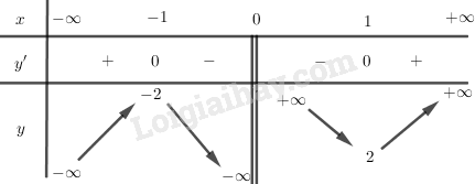 \(\begin{array}{l}y’ < 0 \Leftrightarrow x \in \left( { – 1;1} \right)\\y’ > 0 \Leftrightarrow x \in \left( { – \infty ; – 1} \right) \cup \left( {1; + \infty } \right)\end{array}\)