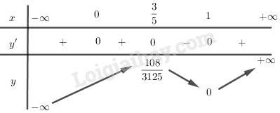 \(\begin{array}{l}y’ < 0 \Leftrightarrow x \in \left( {\frac{3}{5};1} \right)\\y’ > 0 \Leftrightarrow x \in \left( { – \infty ;\frac{3}{5}} \right) \cup \left( {1; + \infty } \right)\\\mathop {\lim }\limits_{x \to -\infty } y = – \infty ;\,\,\mathop {\lim }\limits_{x \to + \infty } y = + \infty \end{array}\)