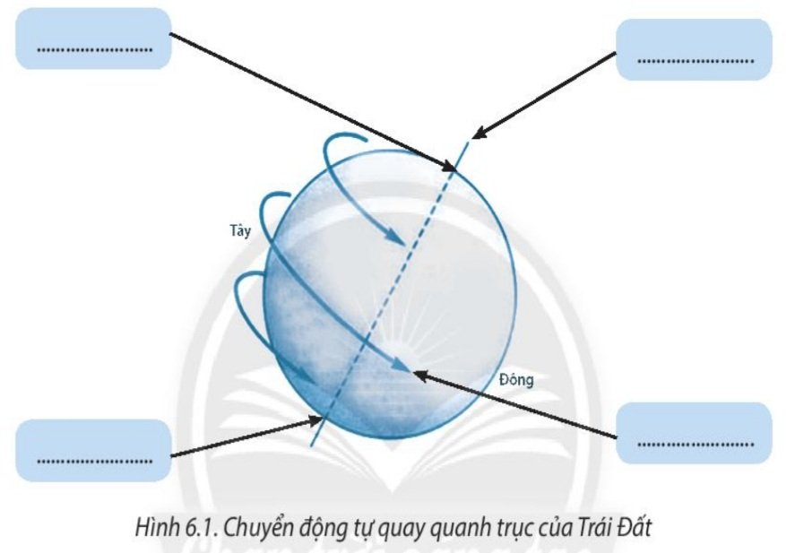 Hãy điền các nội dung thích hợp vào chỗ trống (…) trong hình sau để thể hiện chuyển động tự quay quanh trục của Trái Đất.