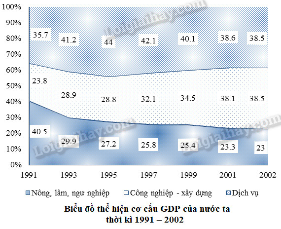 Dựa vào bảng số liệu 16.1 trong SGK, hãy vẽ biểu đồ miền thể hiện cơ cấu GDP của nước ta thời kì 1991 – 2002.