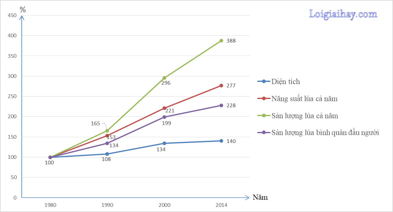 Biểu đồ thể hiện một số tiêu chí tăng trưởng của sản xuất lúa giai đoạn 1980-2014.