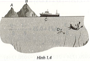 Hình 1.4 mô phỏng vị trí của năm điểm A, B, C, D, E so với mực nước biển. Biết rằng độ cao (tính theo đơn vị kilômét) so với mực nước biển của mỗi điểm là 1 trong các số sau: