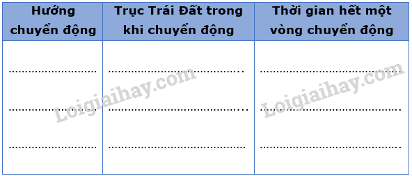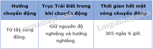 Hãy điền nội dung phù hợp với đặc điểm chuyển động xung quanh Mặt Trời của Trái Đất vào bảng sau:
