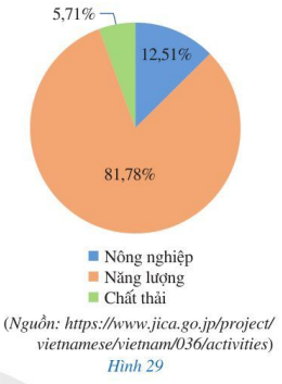Biểu đồ hình quạt tròn ở Hình 29 biểu diễn lượng phát thải khí nhà kính trong ba lĩnh vực: Nông nghiệp, Năng lượng, Chất thải vào năm 2020 của Việt Nam (tính theo tỉ số phần trăm).