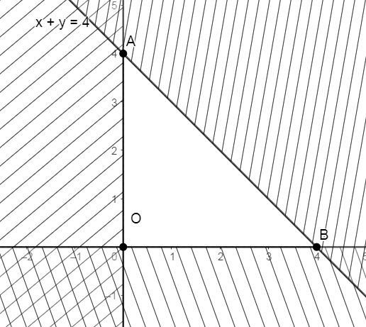 a) \(\left\{ \begin{array}{l}x + y – 4 \le 0\\x \ge 0\\y \ge 0\end{array} \right.\)