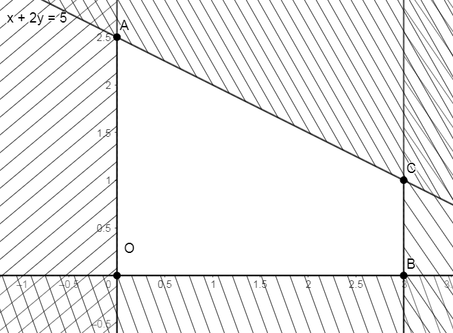 b) \(\left\{ \begin{array}{l}x + 2y – 5 < 0\\0 \le x \le 3\\y \ge 0\end{array} \right.\)