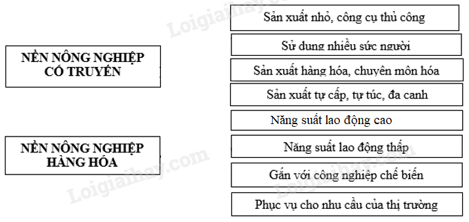 Nối từng ô bên phải với 1 trong 2 ô bên trái sao cho phù hợp với đặc điểm của nền nông nghiệp cổ truyền và nền nông nghiệp hàng hóa.